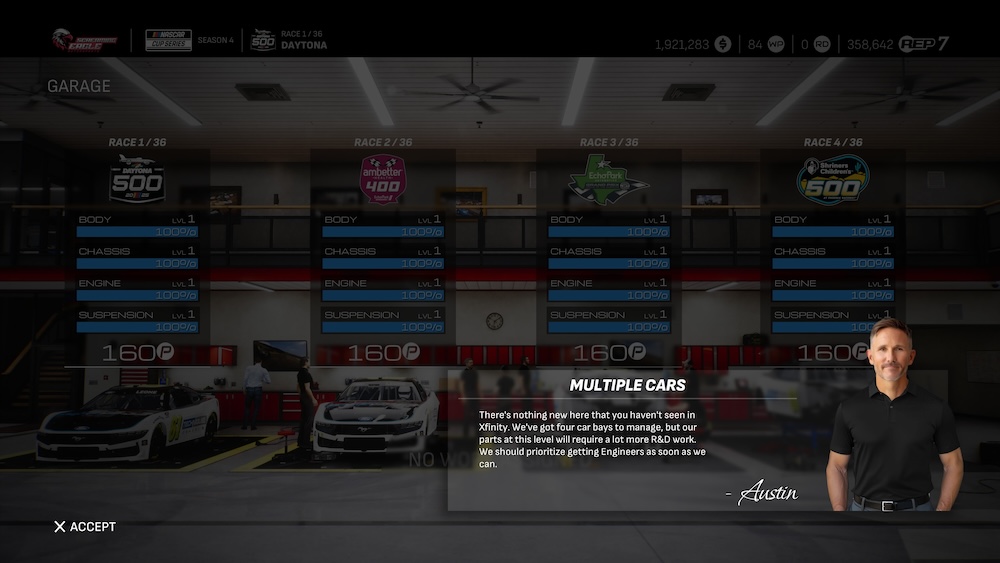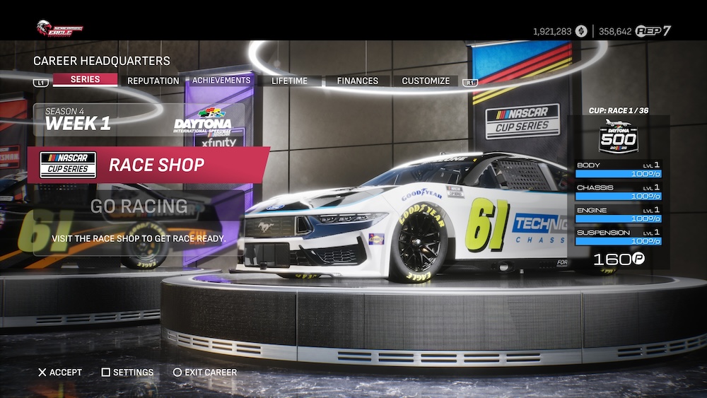 Earning your way into the NASCAR Cup Series requires a Level 7 reputation, or 230,000 RP. As with your past promotions, your new Cup team will see an extra slot in your garage, bringing you to four cars now. And just like the previous series, you’ll start with all Level 1 equipment for the season-opening Daytona 500, while unlocking better parts as the season goes on.