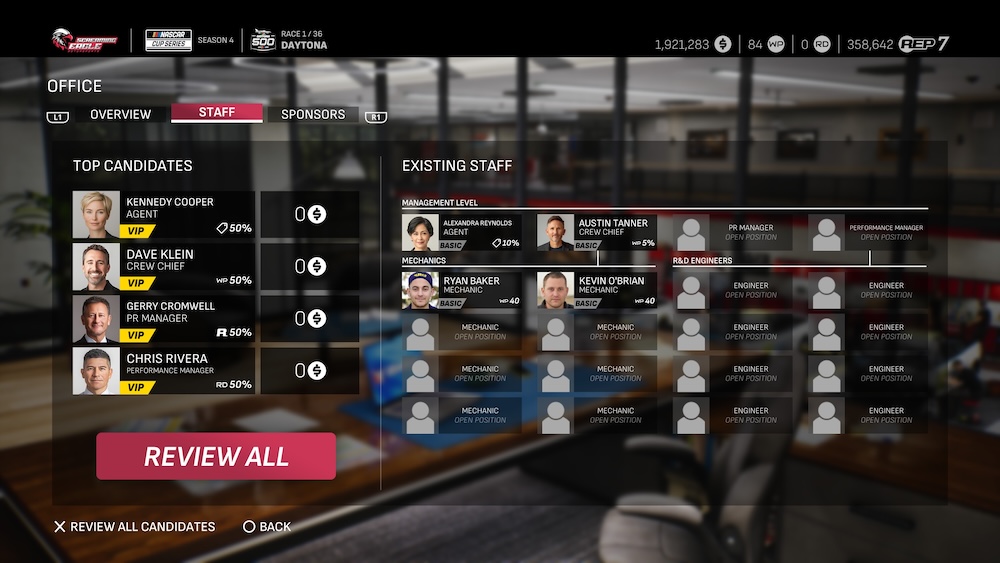 By this point, you should have a strong grasp on the mechanics of Career Mode. Your Crew Chief and Mechanics will be responsible for working on your car, your Performance Manager and Engineers will be responsible for giving you access to the highest caliber parts, your Agent will find you the best sponsorship deals on the market, and your PR Manager will find you opportunities to add to your resources and reputation.