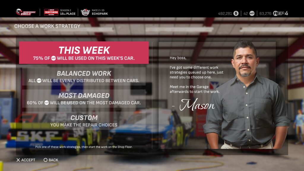 With multiple vehicles to manage in the Truck Series, your Work Points distribution strategy may need to change. If you rely on your Crew Chief to pick the work, they will give you the option to focus work on this week’s entry, the most damaged vehicle, or balance things evenly between both. You can still assign work yourself as well.