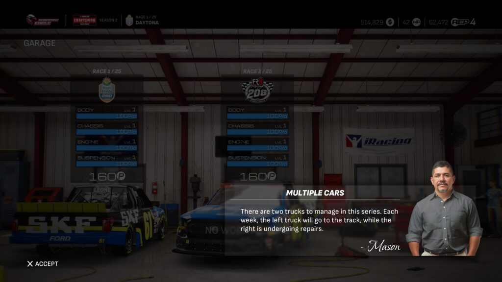 A new series means a new shop and a new Crew Chief and Agent, and additional new PR Manager and Mechanic hires down the road. It also means some new managerial challenges. In the Truck Series, you’ll be managing two vehicles—one that goes to the track, and one that undergoes work so it can run the following race.