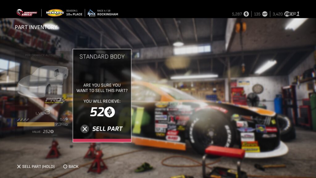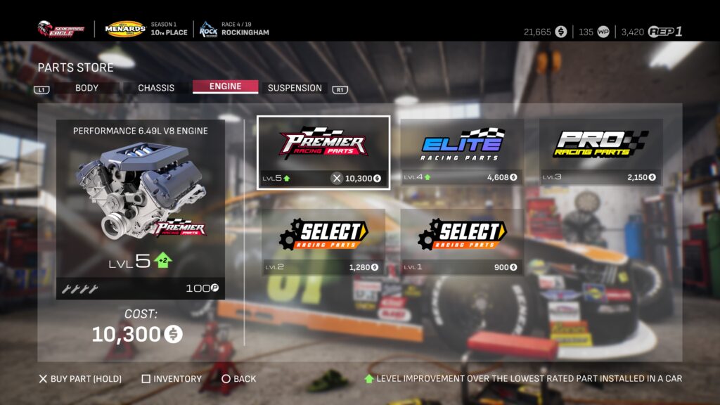 An important part of your race prep is heading to the Parts Shop. Each part on your car has a rating that ranges from 0 to 100, and these scores combine for your car’s overall rating. Your first ARCA car will start out with Level 1 parts in all four categories: Body, Chassis, Engine, and Suspension. Level 1 parts carry a maximum Performance rating of 40.