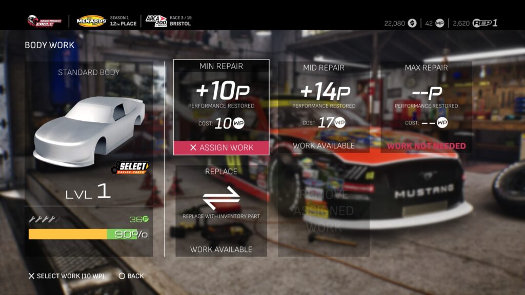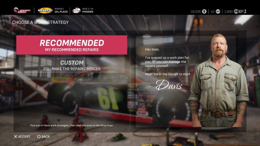 Next up is repairing your car, which can either be done with the recommended plan provided by your Crew Chief or customized based on the amount of Work Points your crew has available. The better your crew, the more work points you’ll have, which will come in handy if you finish a race with battered parts that you absolutely need the next time out.