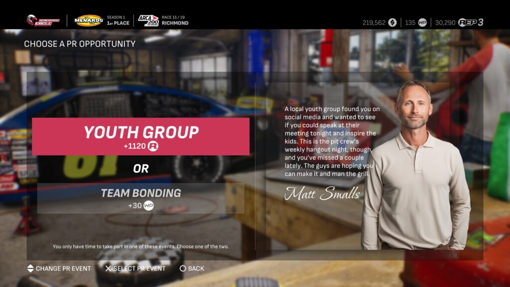 Itching to work your way into the NASCAR Craftsman Truck Series? Need to supercharge those RP boosts to get there? That’s what your PR Manager is there for. Remember, every PR Manager will give you a percentage bonus for your weekend’s work, and they’ll also find you PR opportunities that regularly offer RP boosts when they show up. It can be a good idea to go for the RP whenever you can.