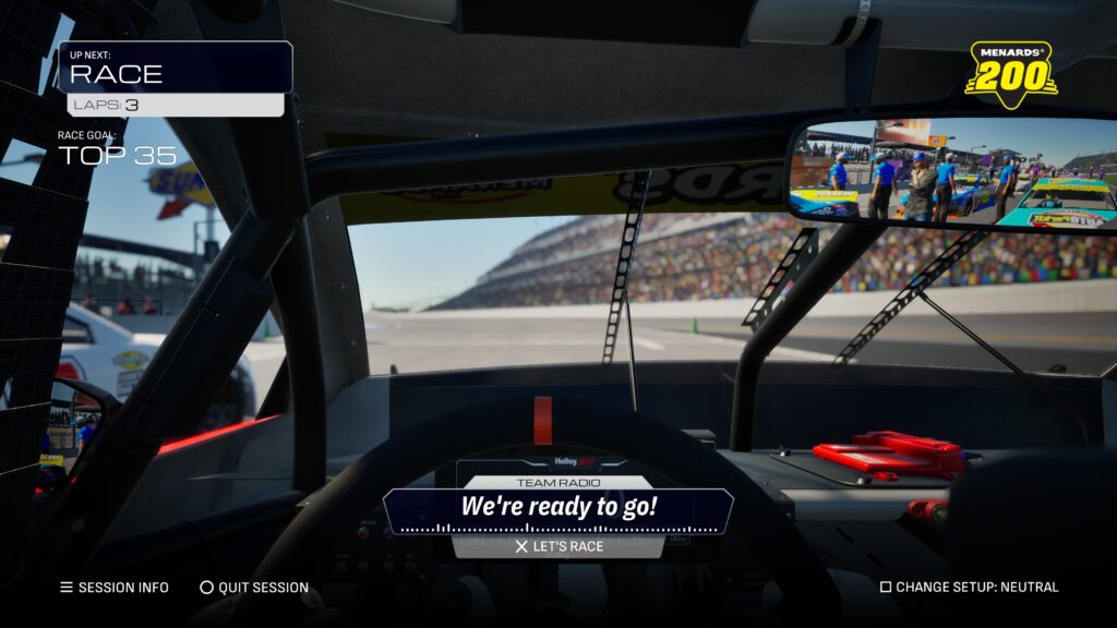 Here it is: your first race weekend! You’ll start with a look at the drivers to watch and the weekend schedule, before jumping into practice. Once again, you’ll have a goal to accomplish for your sponsor. You’ll be able to run laps until you hit the desired lap time, and you’ll be able to end your session whenever you’d like once you do. You can also skip the practice and qualifying sessions if you’re in a rush just to get to the green flag.