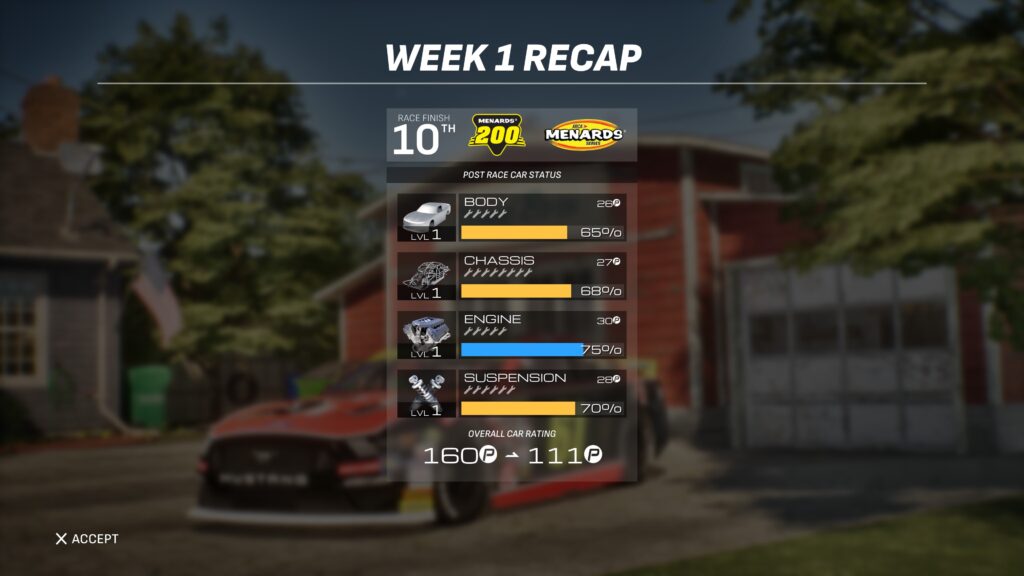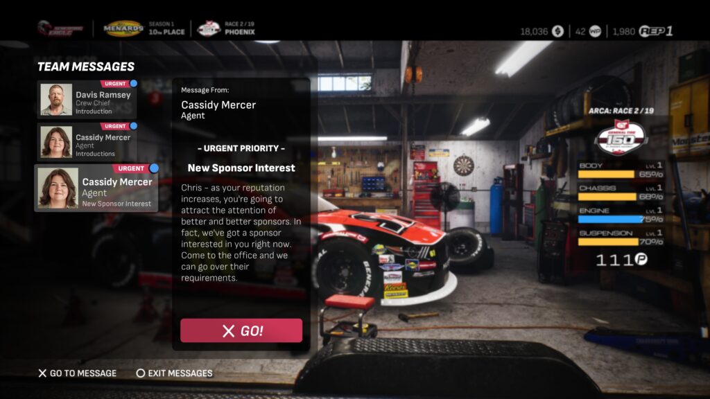 After you leave the track from your first race, you’ll see a set of messages about your performance, earnings from the weekend, and the condition of your car. You shouldn’t head into the next race without doing some repairs, so head into the Race Shop before your next race. There, you’ll meet your Crew Chief and Agent. Your Crew Chief is here to help you organize and perform repairs and upgrade your car, while your Agent will help you sign sponsors.