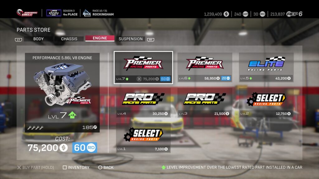 At the start of your time in Xfinity, you’ll only be able to work your way up to purchasing Level 5 parts. Once you’ve hired a Performance Manager and at least one Engineer (of a maximum of six), you’ll start noticing Level 6 parts and higher. Each of these parts won’t just cost money, they’ll also cost R&D Points, similar to how your repairs utilize your Work Points.