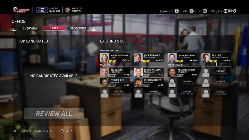 It’ll take you a Level 5 reputation, or 75,000 RP, to be eligible for the Xfinity Series. Much like your move from ARCA into the NASCAR Craftsman Truck Series, you’ll be starting your new team from scratch for the new season, with new employees across the board.