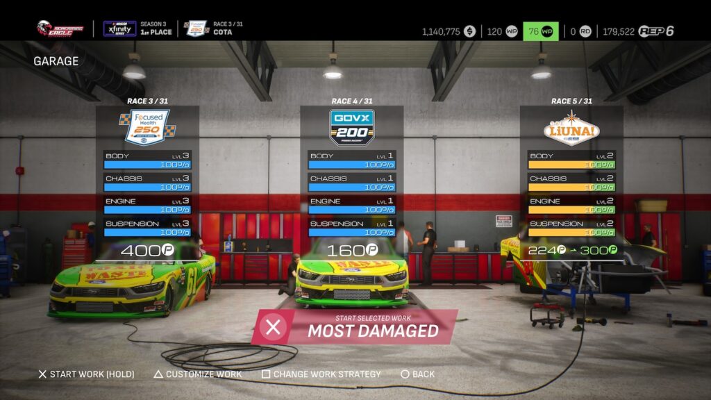 In Xfinity, your car count increases to three. On the one hand, it means that each of your parts will last longer into the season before they wear out and you have to replace them. On the other, you’ll have to make some more strategic choices on when and how to repair your equipment, especially early on when your fleet of mechanics is smaller. With that said, you’ll be able to hire up to six of them eventually, which should give you more than enough Work Points to do anything you need.